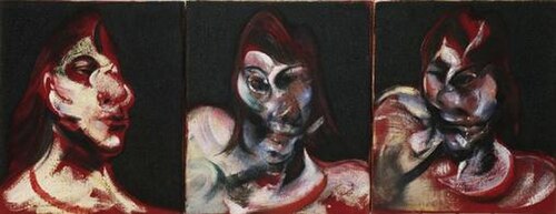 Bacon did not begin to seriously focus on painting until his late twenties, having drifted in the late 1920s and early 1930s as an interior decorator, bon vivant and gambler.[2] He said that his artistic career was delayed because he spent too long looking for subject matter that could sustain his interest. His breakthrough came with the 1944 triptych Three Studies for Figures at the Base of a Crucifixion, which sealed his reputation as a uniquely bleak chronicler of the human condition. From the mid-1960s, he mainly produced portraits of friends and drinking companions, either as single, diptych or triptych panels. Following the suicide of his lover George Dyer in 1971 (memorialised in his Black Triptychs, and a number of posthumous portraits), his art became more sombre, inward-looking and preoccupied with the passage of time and death. The climax of his later period is marked by the masterpieces Study for Self-Portrait (1982) and Study for a Self-Portrait—Triptych, 1985–86.