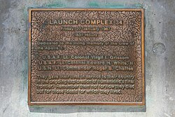 The dismantled Launch Pad 34 at Cape Canaveral Air Force Station bears two memorial plaques to the crew of Apollo 1.[82] The Kennedy Space Center features a memorial exhibit honoring the Apollo 1 crew in the Apollo/Saturn V Center, which includes artifacts and personal mementos of Grissom, Chaffee, and White. Grissom's name is included on the plaque left on the Moon with the Fallen Astronaut statue in 1971 by the crew of Apollo 15.[83]
