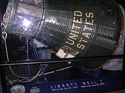On July 21, 1961, Grissom was pilot of the second Project Mercury flight, Mercury-Redstone 4. Grissom named his spacecraft Liberty Bell 7 after the Liberty Bell, and drew a crack on it as a nod to the bell. Liberty Bell 7 was launched from Cape Canaveral, Florida, a sub-orbital flight that lasted 15 minutes and 37 seconds.[17][20] After splashdown in the Atlantic Ocean, the Liberty Bell 7's emergency explosive bolts unexpectedly fired, blowing off the hatch and causing water to flood into the spacecraft. Grissom quickly exited through the open hatch and into the ocean. While waiting for recovery helicopters from USS Randolph to pick him up, Grissom struggled to keep from drowning after his spacesuit began losing buoyancy due to an open air inlet. Grissom managed to stay afloat until he was pulled from the water by a helicopter and taken to the U.S. Navy ship. In the meantime another recovery helicopter tried to lift and retrieve the Liberty Bell 7, but the flooding spacecraft became too heavy, forcing the recovery crew to cut it loose, and it ultimately sank.[20]