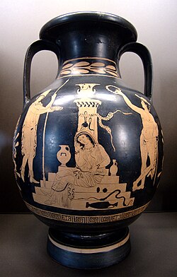 [edit]The Chorus in The Libation Bearers is distinctly different from the one in Agamemnon. From Agamemnon to The Libation Bearers, the Chorus switches from a collection of old, Argive men, to foreign slave women.[11]p. 46-48 Furthermore, the Chorus in Agamemnon possessed a fearful voice, characterized by their critical commentary on the events and characters of the play. Despite this, they play a passive role and do not influence the plot.[11]p. 47-48 In contrast, The Libation Bearers' Chorus desire vengeance, and influence both Electra's and Orestes' actions, shepherding Orestes towards revenge.[11]p. 48-52