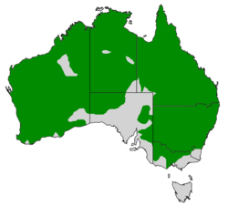 The pied butcherbird is found across much of Australia, except for the far south of the mainland and Tasmania.[25] It is only rarely recorded in the Sydney Basin and absent from the Illawarra, Southern Tablelands, and south coast of New South Wales. In Victoria, it is found along the Murray Valley and west of Chiltern.[35] In South Australia, it is not found in the north-east of the state nor on the Adelaide plain. It is found across Western Australia, though it is absent from the Great Sandy Desert. It is generally sedentary across most of its range, with minimal seasonal movements.[36]