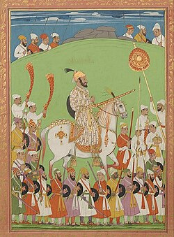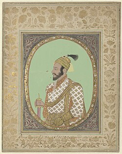 Shivaji I (Shivaji Shahaji Bhonsale, Marathi pronunciation: [ʃiˈʋaːdʑiː ˈbʱos(ə)le]; c. 19 February 1630 – 3 April 1680)[6] was an Indian ruler and a member of the Bhonsle dynasty.[7] Shivaji inherited a jagir from his father who served as a retainer for the Sultanate of Bijapur, which later formed the genesis of the Maratha Kingdom. In 1674, he was formally crowned the Chhatrapati of his realm at Raigad Fort.[8]