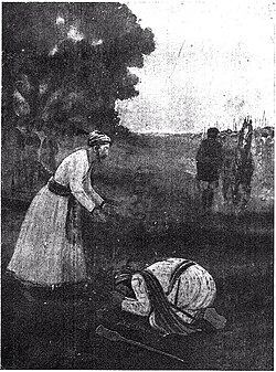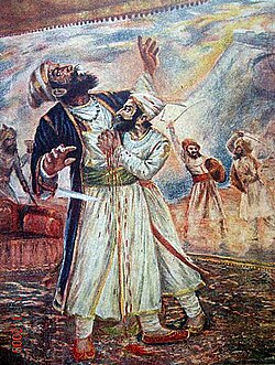 On 28 May, Shivaji did penance for his and his ancestors' not observing Kshatriya rites for so long. Then he was invested by Gaga Bhatt with the sacred thread.[131] On the insistence of other Brahmins, Gaga Bhatt omitted the Vedic chant and initiated Shivaji into a modified form of the life of the twice-born, instead of putting him on a par with the Brahmins. Next day, Shivaji made atonement for the sins, deliberate or accidental, committed in his own lifetime.[132] He was weighed separately against seven metals including gold, silver, and several other articles, such fine linen, camphor, salt, sugar etc. All these articles, along with a lakh (one hundred thousand) of hun, were distributed among the Brahmins. According to Sarkar, even this failed to satisfy the greed of the Brahmins. Two of the learned Brahmins pointed out that Shivaji, while conducting his raids, had killed Brahmins, cows, women, and children. He could be cleansed of these sins for a price of Rs. 8,000, which Shivaji paid.[132] The total expenditure for feeding the assemblage, general almsgiving, throne, and ornaments approached 1.5 million rupees.[133]
