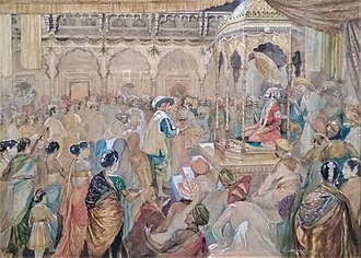 The preparation for a proposed coronation began in 1673. However, some controversies delayed the coronation by almost a year.[120] One controversy erupted amongst the Brahmins of Shivaji's court: they refused to crown Shivaji as a king because that status was reserved for those of the kshatriya varna (warrior class) in Hindu society.[121] Shivaji was descended from a line of headmen of farming villages, and the Brahmins accordingly categorized him as a Maratha, not a Kshatriya.[122][123] They noted that Shivaji had never had a sacred thread ceremony, and did not wear the thread, such as a kshatriya would.[124] When Shivaji came to know about this conspiracy, he later bribed and summoned Gaga Bhatt, a pandit of Varanasi, who stated that he had found a genealogy proving that Shivaji was descended from the Sisodias, and thus indeed a kshatriya, albeit one who had not had the ceremonies.[125][126][127] To enforce this status, Shivaji was given a sacred thread ceremony, and remarried his spouses under the Vedic rites expected of a kshatriya.[128][129] However, according to historical evidence, Shivaji's claim to Rajput, and specifically of Sisodia ancestry, may be seen as tenuous at best, to purely invented.[130]