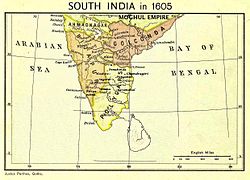 In 1636, the Sultanate of Bijapur invaded the kingdoms to its south.[7] The sultanate had recently become a tributary state of the Mughal Empire.[7][37] It was being helped by Shahaji, who at the time was a chieftain in the Maratha uplands of western India. Shahaji was looking for opportunities of rewards of jagir land in the conquered territories, the taxes on which he could collect as an annuity.[7]