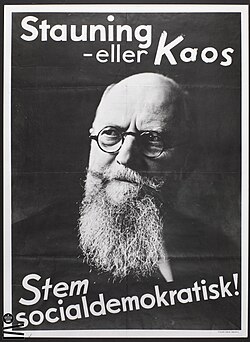 In January 1933, Stauning's government entered into what was then the most extensive settlement yet in Danish politics, namely the Kanslergade settlement (Danish: Kanslergadeforliget) with the liberal party Venstre.[25] The settlement was named after Stauning's apartment in Kanslergade in Copenhagen and included extensive agricultural subsidies and reforms of the legislation and administration in the social sector.[26] In 1935, Stauning was reelected with the famous slogan "Stauning or Chaos".[27] Stauning's second cabinet lasted until the Nazi occupation of Denmark in 1940, when the cabinet was widened to include all political parties for a national unity government and the Danish government pursued a collaborative policy with the German occupiers. Through the 1940s and until 1972, most of Denmark's Prime Ministers were from the party.[28]