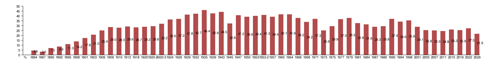| Year | Leader | Votes | % | ± pp | Seats | +/– | Rank | Result |