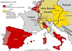 [edit]The Italian Wars between the House of Valois and the House of Habsburg began in 1494, and lasted for over 60 years. For much of this period, Spain and the Holy Roman Empire were ruled by Emperor Charles V until he abdicated in January 1556 and divided his possessions. The lands of the Habsburg monarchy, often referred to as "Austria", went to his brother Ferdinand, who was also elected Holy Roman Emperor. His son Philip II of Spain, who married Mary I of England in July 1554, already ruled the Spanish Netherlands and Milan in his own right. To these possessions were added the Spanish Empire, Naples, Sicily, and Sardinia.[2]
