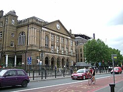 [edit]Whitechapel's spine is the old Roman Road, that ran from the Aldgate on London's Wall, to Colchester in Essex (Roman Britannia's first capital), and beyond. This road, which was later named the Great Essex Road, is now designated the A11. This historic route has the names Whitechapel High Street and Whitechapel Road as it passes through, or along the boundary, of Whitechapel.[8] For many centuries travellers to and from London on this route were accommodated at the many coaching inns that lined Whitechapel High Street.[9]