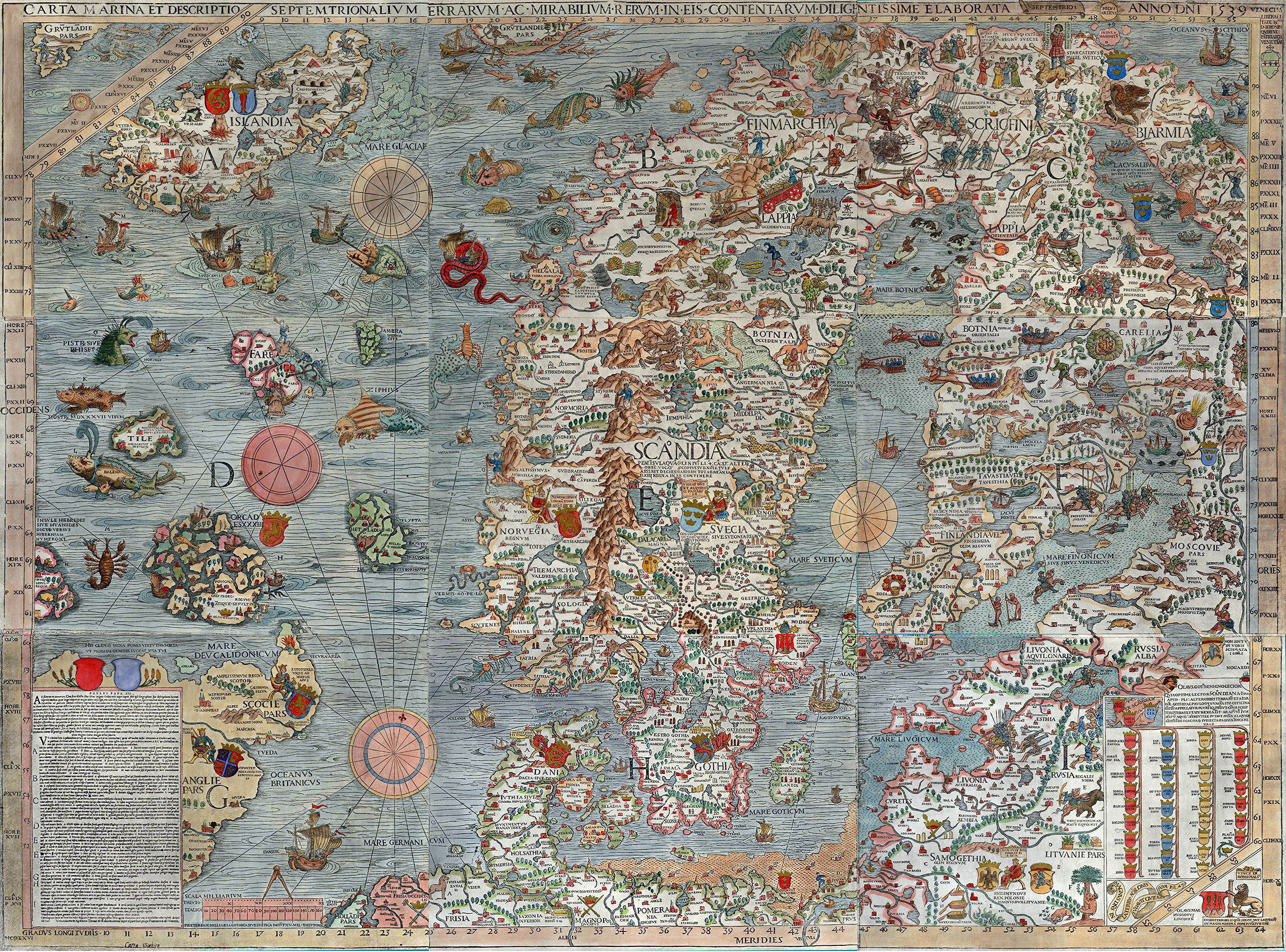 The map is divided in 3×3 sheets with the dimension 55x40 cm (height×width) because they were used in the printing process to transfer it onto a wood carved stamps. The notes on the map in Latin were translated by Olaus himself into the Italian and German language. Historia de gentibus septentrionalibus (Rome, 1555) is a much larger commentary on the map.