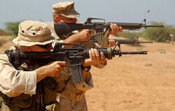 Three soldiers armed with assault rifles engage in target practice during a two-day live-fire exercise. PD picture, currently used in the article live fire exercise.
