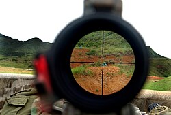 Oppose - I'm sure it can't be impossible to get a better shot than this - until then we'll have to do without a sniperscope FP. It seems genuine to me, just not all that well-executed. --YFB¿02:25, 26 November 2006 (UTC)[reply]