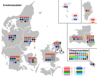 The 179 members of the Folketing are elected in Denmark (175), the Faroe Islands (2), and Greenland (2). The 175 seats in Denmark include 135 seats elected in ten multi-member constituencies of Denmark by proportional representation, using the d'Hondt method (kredsmandater), and 40 leveling seats, allocated to parties in order to address any imbalance in the distribution of the constituency seats (tillægsmandater). The main threshold for levelling seats is 2%.[22][23]