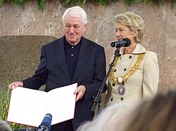 His awards include the Premio letterario Elba (1967),[35] and almost every major German-language literary prize, including the Heinrich von Kleist Prize (1985),[36] the Heinrich-Böll-Preis (1993)[37] and the Schiller Memorial Prize (2001).[38] Kluge received the Hanns-Joachim-Friedrichs-Award for TV Journalism (2001).[39] He has also received the Georg Büchner Prize (2003), Germany's highest literary award.[3][40] Kluge received the triennial Theodor W. Adorno Award in 2009.[41] In 2010 Kluge was awarded the Grimme-Preis, one of the most important German television awards, in honour of his lifetime achievements.[3][42] He was awarded the Heinrich Heine Prize in 2014, the Klopstock Prize in 2019,[3] and the Pour le Mérite for Sciences and Arts in 2024.[43]