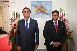 On 26 May 2020, the preliminary results of the 2020 Surinamese general election showed that the VHP was the largest party, and that Chan Santokhi was the most likely candidate to become the ninth President of Suriname.[22] On 30 May, Chan Santokhi announced his candidacy for President of Suriname.[23] On 29 June, the VHP nominated Chan Santokhi as their candidate for the Presidency.[24] On 7 July, the coalition nominated Chan Santokhi as president and Ronnie Brunswijk as Vice President.[25] No other candidates had been nominated on 8 July 2020, 15:00 (UTC−3), and on 13 July, Santokhi was elected as president by acclamation in an uncontested election.[26][27][28] He was inaugurated on 16 July, on the Onafhankelijkheidsplein in Paramaribo in ceremony without the public due to the COVID-19 pandemic.[29][3] He took his oath reciting Hindu Sanskrit shlokas and mantras in his oath ceremony.[30] Santokhi's inauguration was also blessed by several Christian religious leaders.[31][32]