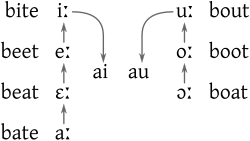 The period of Early Modern English, lasting between 1500 and 1700, was characterised by the Great Vowel Shift (1350–1700), inflectional simplification, and linguistic standardisation. The Great Vowel Shift affected the stressed long vowels of Middle English. It was a chain shift, meaning that each shift triggered a subsequent shift in the vowel system. Mid and open vowels were raised, and close vowels were broken into diphthongs. For example, the word bite was originally pronounced as the word beet is today, and the second vowel in the word about was pronounced as the word boot is today. The Great Vowel Shift explains many irregularities in spelling since English retains many spellings from Middle English, and it also explains why English vowel letters have very different pronunciations from the same letters in other languages.[50][51]