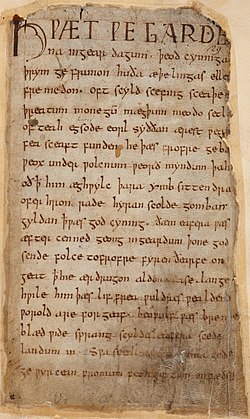 Old English was divided into two Anglian dialects (Mercian and Northumbrian) and two Saxon dialects (Kentish and West Saxon).[30] Through the influence exerted by the kingdom of Wessex, and the educational reforms instated by King Alfred during the 9th century, the West Saxon dialect became the standard written variety.[31] The epic poem Beowulf is written in West Saxon, and the earliest English poem, Cædmon's Hymn, is written in Northumbrian.[32] Modern English developed mainly from Mercian, but the Scots language developed from Northumbrian. During the earliest period of Old English, a few short inscriptions were made using a runic alphabet.[33] By the 7th century, a Latin alphabet had been adopted. Written with half-uncial letterforms, it included the runic letters wynn ⟨ƿ⟩ and thorn ⟨þ⟩, and the modified Latin letters eth ⟨ð⟩, and ash ⟨æ⟩.[33][34]