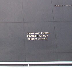 The dismantled Launch Pad 34 at Cape Canaveral Air Force Station bears two memorial plaques to the crew of Apollo 1.[82] The Kennedy Space Center features a memorial exhibit honoring the Apollo 1 crew in the Apollo/Saturn V Center, which includes artifacts and personal mementos of Grissom, Chaffee, and White. Grissom's name is included on the plaque left on the Moon with the Fallen Astronaut statue in 1971 by the crew of Apollo 15.[83]