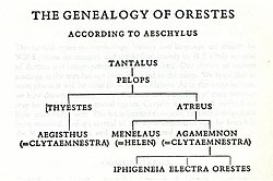 [edit]Retaliation is seen in the Oresteia to cascade. In Agamemnon, it is mentioned that Agamemnon had to sacrifice his innocent daughter Iphigenia to shift the wind for his voyage to Troy.[19] This caused Clytemnestra to plot revenge on Agamemnon. She found a new lover Aegisthus and when Agamemnon returned to Argos from the Trojan War, Clytemnestra killed him by stabbing him in the bathtub and went on to inherit his throne.[2] The death of Agamemnon thus sparks anger in Orestes and Electra; they plot matricide (the death of their mother Clytemnestra) in the next play, Libation Bearers. Through much pressure from Electra and his cousin Pylades, Orestes kills Clytemnestra and her lover, Aegisthus.[19] Consequently, Orestes is hunted down by the Furies in the third play The Eumenides. Even after he escapes, Clytemnestra's spirit comes back to rally them again so that they can kill Orestes and obtain vengeance for her.[19] However, this cycle of retaliation comes to a stop near the end of The Eumenides when Athena decides to introduce a new legal system for dealing out justice.[2]
