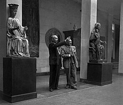 During World War II, Picasso remained in Paris while the Germans occupied the city. Picasso's artistic style did not fit the Nazi ideal of art, so he did not exhibit during this time. He confused Germans who came to steal both his and Matisse's paintings from a bank vault, disparaging the value of his work and distracting them from a more thorough search, thus protecting their collections.[74] He was often harassed by the Gestapo. During one search of his apartment, an officer saw a photograph of the painting Guernica. "Did you do that?" the German asked Picasso. "No," he replied, "You did."[75]
