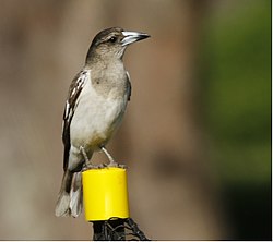 [edit]The black hood helps distinguish the pied butcherbird from other butcherbirds, the Australian magpie, and the much smaller magpie-lark, the latter of which also has a much smaller beak.[25] It has a higher-pitched call than the grey butcherbird and inhabits more open habitat.[34] The juvenile pied butcherbird resembles the grey butcherbird: it has a buff upper throat and dark brown instead of black plumage.[27]