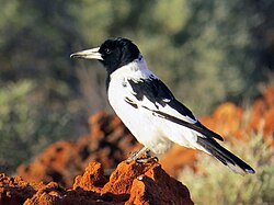 "Pied butcherbird" has been designated the official English name by the International Ornithological Committee (IOC).[16] "Black-throated butcherbird" is an alternative common name, as are "Break o'day boy" and "organbird".[17] Leach also called it the "black-throated crow-shrike",[18] a name used by Gould for subspecies nigrogularis while calling subspecies picatus the "pied crow-shrike".[19] 'Jackeroo' is a colloquial name from the Musgrave Ranges in Central Australia.[20] Gould recorded Ka-ra-a-ra as a name used by indigenous people of Darwin.[19] The Ngarluma people of the western Pilbara knew it as gurrbaru.[21] In the Yuwaaliyaay dialect of the Gamilaraay language of southeastern Australia, it is buubuurrbu.[22] Names recorded from central Australia include alpirtaka and urbura in the Upper Arrernte language.[23]