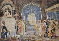 After Shivaji's escape, hostilities with the Mughals ebbed, with the Mughal Sardar Jaswant Singh acting as an intermediary between Shivaji and Aurangzeb for new peace proposals.[105] Between 1666 and 1668, Aurangzeb also conferred the title of Raja on Shivaji, although he did not restore his right over the forts.[106] Sambhaji was also restored as a Mughal mansabdar with 5,000 horses. At that time Shivaji sent Sambhaji and General Prataprao Gujar, to serve with Prince Mu'azzam, the Mughal viceroy in Aurangabad. Sambhaji was also granted territory in Berar for revenue collection.[107] Aurangzeb also permitted Shivaji to attack Bijapur, ruled by the decaying Adil Shahi dynasty; the weakened Sultan Ali Adil Shah II sued for peace and granted the rights of sardeshmukhi and chauthai to Shivaji.[108]