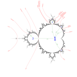 The dynamical formula for the uniformisation of the complement of the Mandelbrot set, arising from Douady and Hubbard's proof of the connectedness of , gives rise to external rays of the Mandelbrot set. These rays can be used to study the Mandelbrot set in combinatorial terms and form the backbone of the Yoccoz parapuzzle.[15]