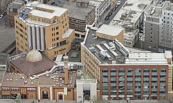 In 1985 this large, purpose-built mosque with a dome and minaret was built in the heart of Whitechapel, attracting thousands of worshippers every week, and it was further expanded with the London Muslim Centre in 2004.[45]